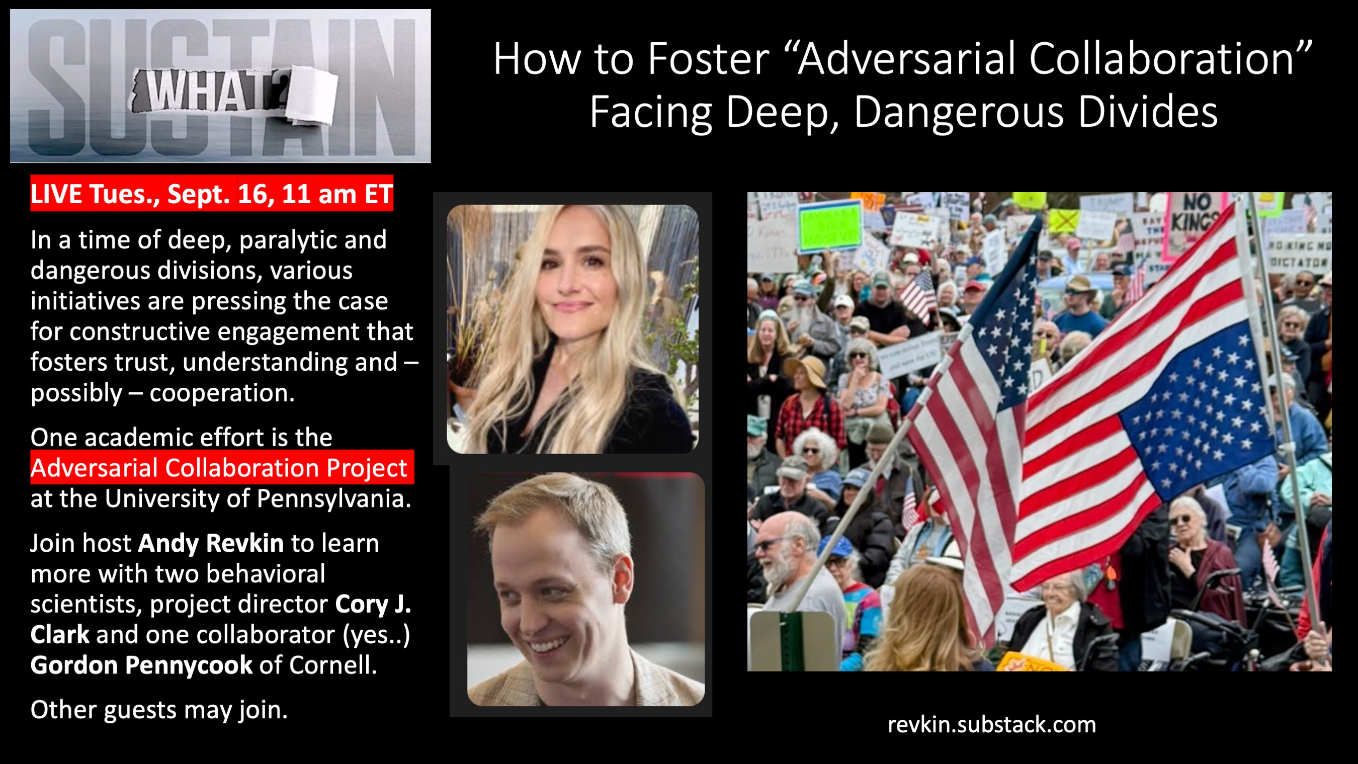 With all of this in mind, join me this Tuesday, September 16, at 11 a.m. Eastern, for a relevant discussion of the merits of constructive engagement with intellectual or ideological opponents, centered on the Adversarial Collaboration Project hubbed at the University of Pennsylvania. You’ll meet project director Cory J. Clark and Gordon Pennycook, an associate professor of psychology at Cornell.