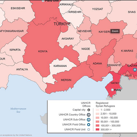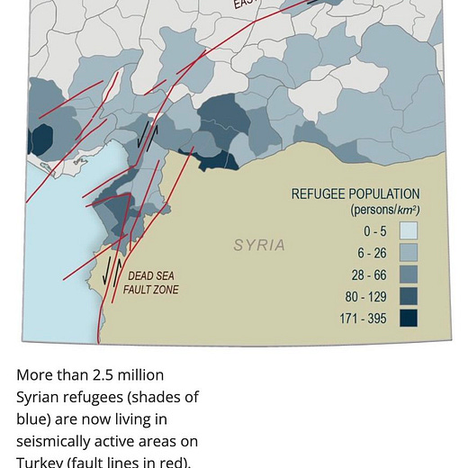 Here’s the latest map of Turkey’s population of around 4 million registered refugees (nearly all from Syria) - the world’s largest for the eighth year in a row. Compre those high-density provinces to the earthquake map above.