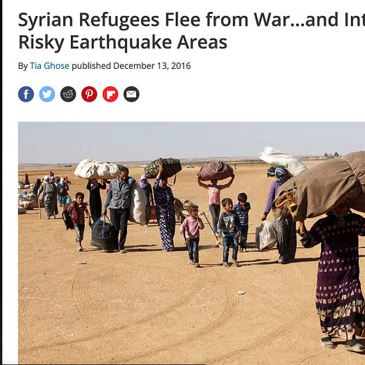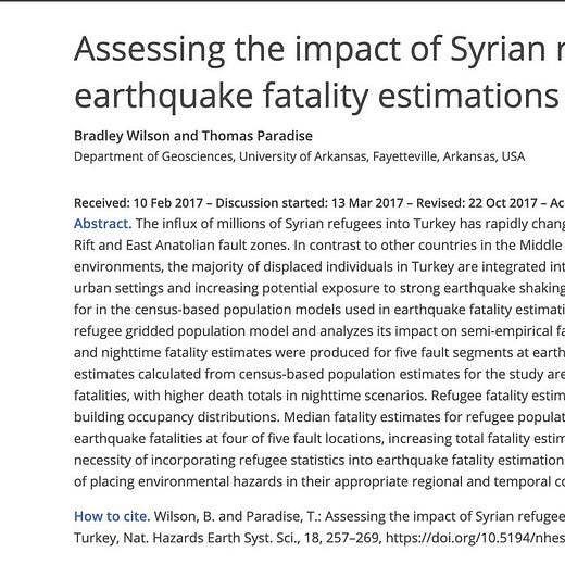 But even worse, this part of Turkey has in recent years accommodated millions of refugees from Syria, ballooning the potential popualtion at risk. A 2018 paper that I tweeted about last night projected how this flow of dislocated people could swell urban losses.