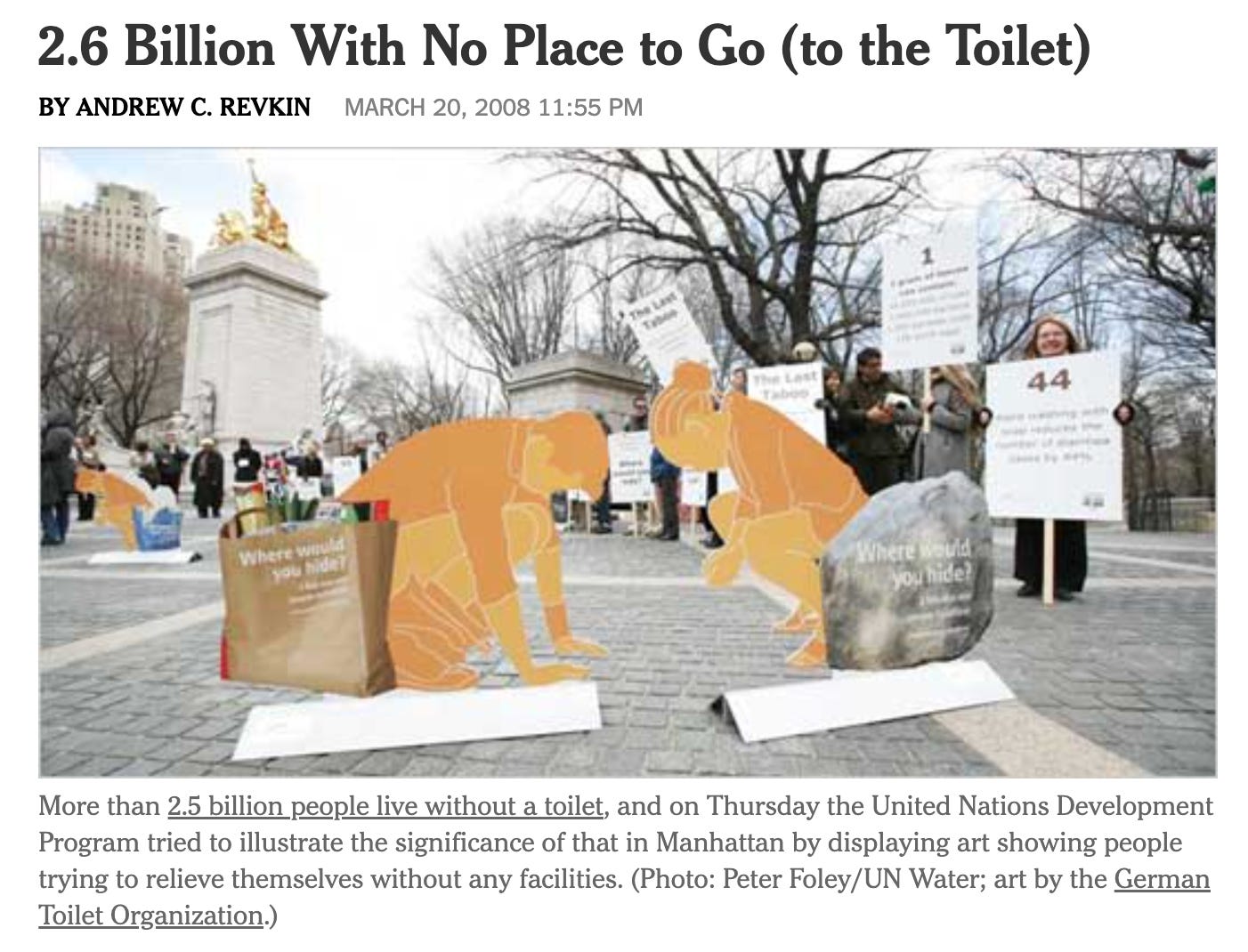Back in 2008, when the United Nations estimated that 2.6 billion people had no safe place to excrete, I wrote a couple of Dot Earth posts about the hazards of open defecation. One had this artwork (I went to this demonstration at Columbus Circle):