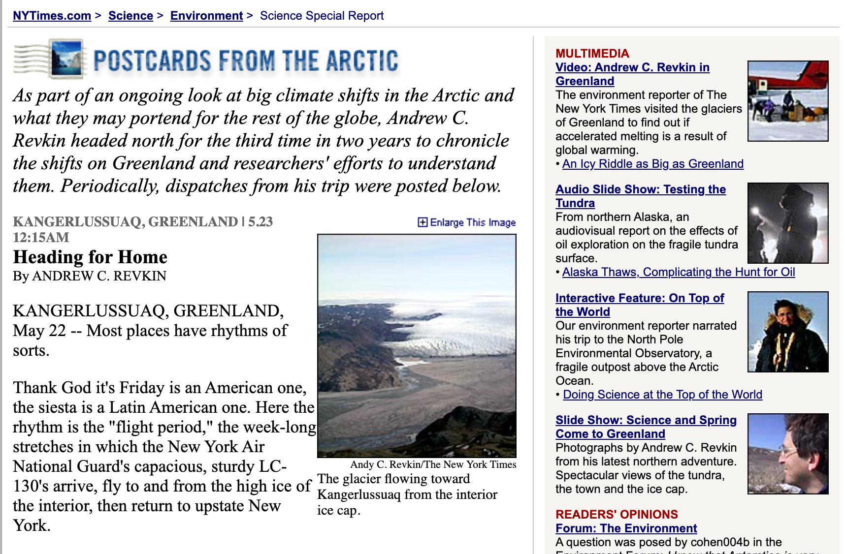 I headed to Greenland to report on momentous questions around how fast its melting ice sheet - five times the size of California - could raise global sea levels. A lot of my Arctic reporting is aggregated on this antique archived New York Times page, including my first real blogging effort - a series of Postcards from the Arctic from Greenland.