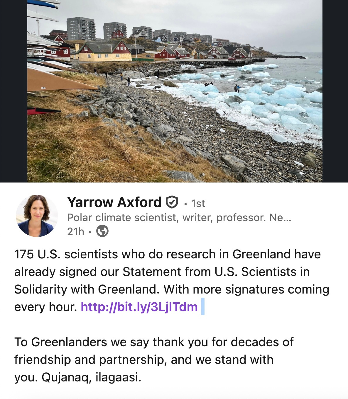 Post-webcast updates - I hope you’ll watch this conversation with authors of a new joint statement of support for Greenlanders from 200 (and counting) American scientists who’ve worked on that vast ice-sheathed island. The statement seeks respect and security for 57,000 Greenland citizens and for adherence to international norms more than a particular outcome.