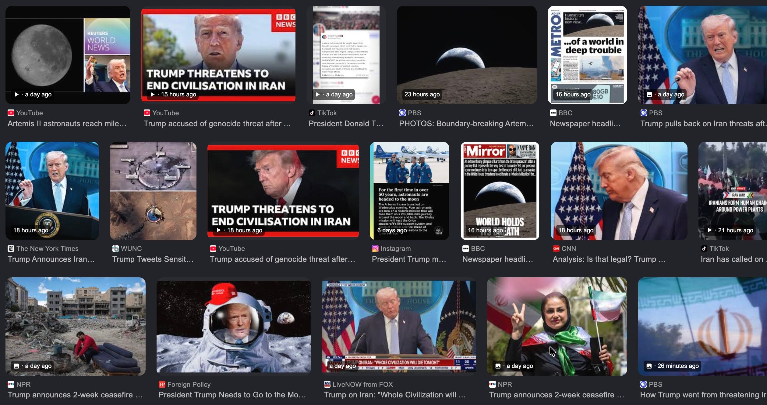 Few moments better illustrate the bifurcated “divine and felonious” naure of the human species (a description from Bill Bryson’s 2003 book A Short History of Nearly Everything) than astronauts circling the Moon and Trump issuing a threat to end a civilization at the same time.